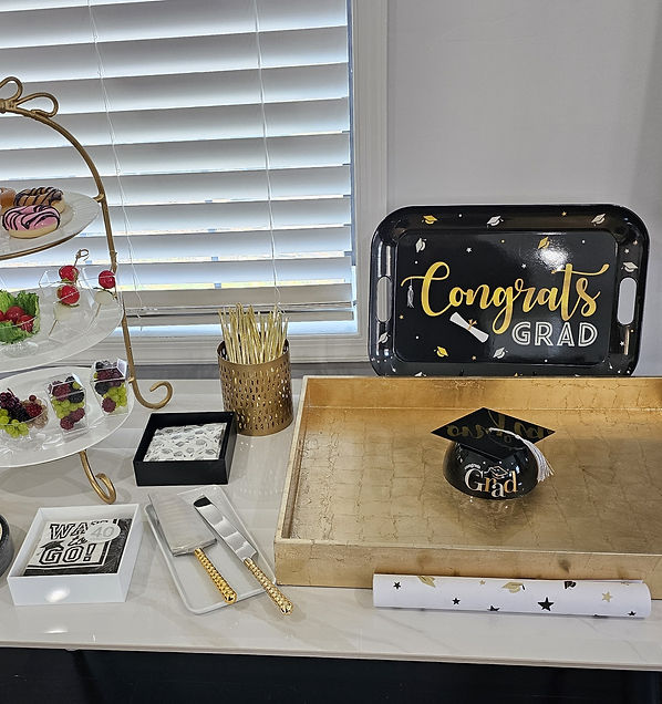 We have 50+ acrylic chargers with a gold beaded border to add casual elegance. The Happy New Year plates can be added for celebrations or swap the plates and sign for birthday celebrations. We have 2 round and 8 rectangle black linens for buffet tables.